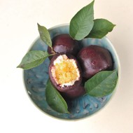 Melt 150 grams of butter to 97°F. Using a blender, create an emulsion with the yolk, 120 grams of passion fruit puree, and 90 grams of sugar.