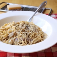 Cook the spaghetti (preferably brands like Barilla or De Cecco) in salted water according to the instructions (usually no more than 8–10 minutes) until al dente. During cooking, add some of the pasta water (approximately half a cup) to the pancetta.
