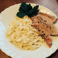 Serve the pasta together with the meat. I always add a bit of greenery to enhance the flavor!