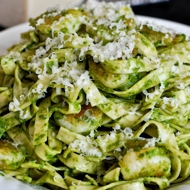 Cook the pasta. Blend the lemon juice and zest, avocado, basil, salt, and pepper in a blender.
