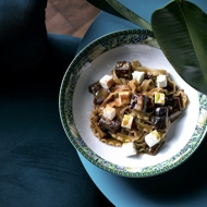 Toss the pasta with the sauce and eggplants, then plate it.