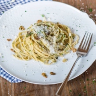 Heat the olive oil in a pan. Sauté the garlic for 1-3 minutes. Add the reserved pasta cooking water.