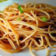 While the pasta is cooking, heat the vegetable oil in a pan. Add the minced garlic and sauté lightly. Pour the soy sauce into the pan.