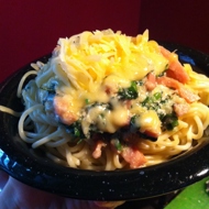 Place the pasta on a plate and pour the sauce over it. You can sprinkle with grated cheese. Enjoy your meal!