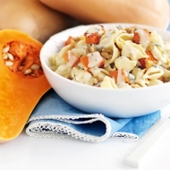 Meanwhile, in a small saucepan, combine the cream and crumbled cheese, stirring, and cook for about 3 minutes until the cheese melts.