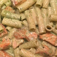 The salmon in this dish can be replaced with chicken or shrimp. I usually make the pesto sauce myself; it's not difficult at all, and it turns out more aromatic than store-bought.