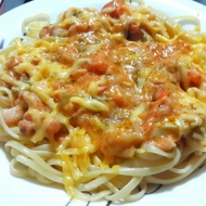 Plate the spaghetti with seafood in a creamy sauce. Sprinkle grated cheese on top.