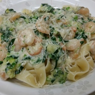 Pasta with shrimp and spinach in creamy garlic sauce.