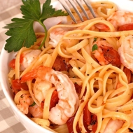 Pasta with shrimp, tomatoes, and basil
