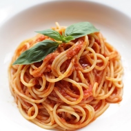 Rinse the cooked spaghetti. Place it in a pan with olive oil, add the tomato puree and Italian herb mix. Simmer uncovered until excess liquid evaporates.