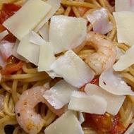 Add the shrimp, spaghetti, and a bit of the reserved pasta cooking water to the sautéed tomatoes; at this stage, you can also add spices and butter (any spices can be used).