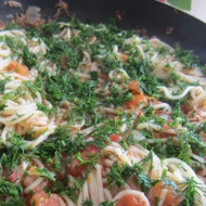 Drain the cooked pasta in a colander, then return it to the skillet and cook over low heat for a few minutes to allow it to absorb the sauce. Sprinkle the finished pasta with chopped fresh herbs and spices.