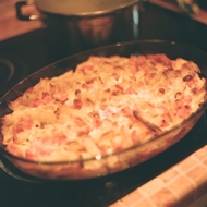 In a large bowl, pour the béchamel sauce over the cooked pasta, add cheese and ham, and mix well.