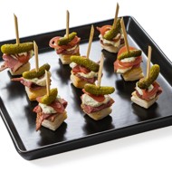 Serve the pastrami and gherkin canapés at the festive table.