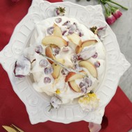 Spread the meringue with cream, layer some peaches on top, and cover with a second meringue. Repeat the process with cream and fruit. Sprinkle the dessert with candied petals. Drizzle with rose syrup on top if desired.