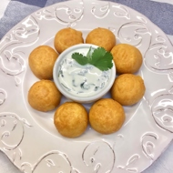 Pea Croquettes with Cheese, Matsoni, and Cilantro