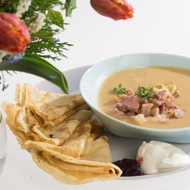 A hearty, rich soup with butter and whipped cream, along with a generous amount of aromatic seasonings — marjoram, thyme, cloves, and Dijon mustard. The pancakes are served separately, and you can enjoy the soup without them if you prefer.