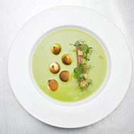 Quickly torch the meringues with a culinary blowtorch until a crust forms. Carefully pour the hot pea soup into the bowl, ensuring that the liquid does not completely cover the terrine block and the meringues. Garnish with fresh pea greens.