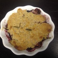 Place the peach filling into individual baking dishes and top with the crumble mixture, leaving some gaps for the peach mixture to breathe.