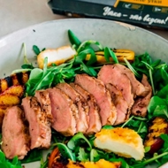 While the duck is resting, wash and slice the fruits, then grill them in a grill pan until golden brown—add a little sugar with a drop of water for caramelizing the slices if desired.