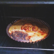Finally, pour the cheese mixture on top. Arrange the slices for decoration on top. Place in an oven preheated to 338°F for 30 minutes.