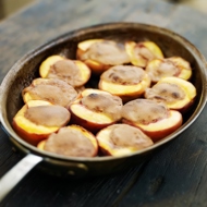When the peaches are ready, pour warm brandy on top and ignite. Serve while flaming.