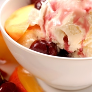 Cut the peaches into pieces and arrange them on 4 plates. Place a large scoop of ice cream next to each and drizzle with the berry sauce.