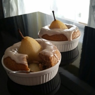Place portion cups on a baking sheet; their diameter should be about twice that of the pear. Pour the batter just above halfway. Then, carefully sink the pears into the center. There should be a couple of centimeters of space left. If desired, you can drizzle the dessert with sauce on top now. Place in a preheated oven at 356°F and bake for about 20-30 minutes. You can tell the dessert is ready by the golden crust that forms (the batter will rise beautifully) and by inserting a toothpick; it should come out dry. It’s best served immediately, generously drizzled with sauce (if it has thickened, warm it in a saucepan for a minute). Look at how beautiful it turns out; the dessert is very tasty and juicy, thanks to the caramel sauce.
