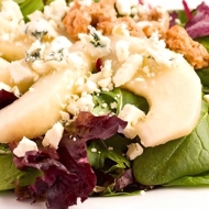 Core the pear and slice it thinly. Place the slices on top of the salad.