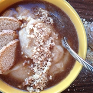 Transfer the porridge to a warmed plate, drizzle with two to three teaspoons of cinnamon sauce on top, sprinkle with gingerbread crumble, and serve immediately.
