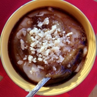 Pear Semolina Porridge with Marzipan Crumble and Pears in Syrup