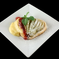 Pears in Campari with Raspberry Sauce and Mascarpone Cream