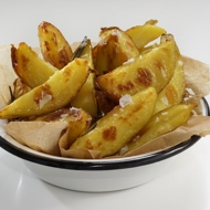 First, wash and cut the potatoes: large ones into wedges, medium ones in half, and you can leave the very small ones whole. It's important that all the pieces are the same size, approximately the size of a quarter of a chicken egg.