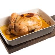 Brush the chicken with this mixture. Return the chicken to the oven for another 10 minutes. To check if the chicken is done, pierce the meat in the crease between the thigh and breast and observe the color of the juices that flow out. If the juices are clear, the chicken is ready.