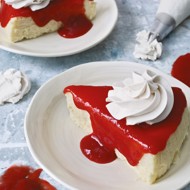 Cut a piece of cheesecake and drizzle it with strawberry sauce.