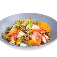 A salad featuring persimmon, fresh vegetables, and goat cheese.