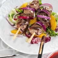 Serve the heart kebabs with a mix of salad greens, peeled segments of fresh oranges, and red onions pickled in vinegar and sugar.