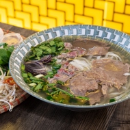 Place the noodles in a soup bowl, top with slices of meat, then add herbs and julienned green onions. Pour hot broth over everything and add both sauces.