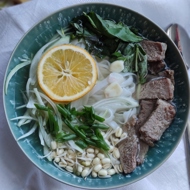 In a bowl, arrange the noodles, meat, onion, soybean sprouts, herbs, pour over the broth, and drizzle with lemon juice on top.