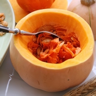 Take a medium pumpkin, wash it thoroughly, and carefully cut it in half. Remove the flesh along with the seeds and use a sharp knife to scrape the inner walls of the pumpkin.