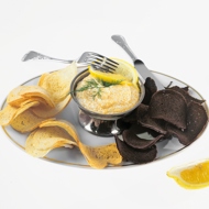 Gently mix the caviar with mayonnaise (which can be made from scratch) and cream, add the onion, and serve with bread chips, garnished with a slice of lemon and dill.