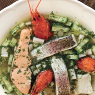 Place pieces of fish, boiled crayfish tails (in the photo, crayfish shells filled with pike quenelle), sliced vegetables, and herbs into a serving dish. Pour over the mixture of fish soup, kvass, and brine. The pike dish is ready; serve it cold.