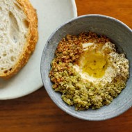 For the tapenade: finely chop the olives and capers, mix them together, and add extra virgin olive oil and a powder made from dried anchovies.