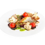 Place the cooked fillet on a plate, add a little mashed potatoes, roasted cauliflower florets, a few pickled cherry tomatoes, and seaweed. Garnish with tapioca 'caviar' and sprigs of dill.