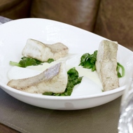 Place a couple of large spoonfuls of cauliflower puree on each plate, and add some spinach beside it.