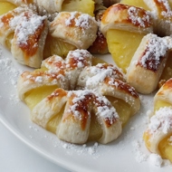 Next, on a lightly floured surface, roll out the puff pastry to a thickness of 2–3 mm and cut it into long strips 1–1.5 cm wide. Wrap a strip around each pineapple ring.