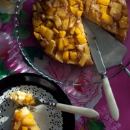 Ingredients are for a 23 cm (9 inch) pan. This is an adapted recipe from John Smith, but without macadamia nuts and the fruit arrangement: the original recipe suggests cutting the pineapples into rings and arranging the mango around them. I used fresh fruit, but canned fruit can also be used. In that case, be careful with the amount of sugar, as canned fruit is often sweet.