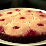 In a greased baking dish, place the canned pineapple rings at the bottom. In each ring, and between them, place the cherries. Pour the prepared dough over the fruits.