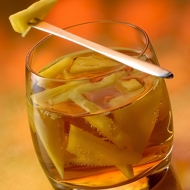 Serve in the presence of guests in large glass cups or goblets with saucers. Serve with a straw and a spoon for the fruit.