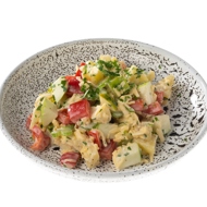 Pineapple salad, regardless of the ingredients that accompany it, is a notable dish from coast to coast. A post-Soviet classic that vividly demonstrates how limited store selection influenced home recipes. The most popular dish featuring pineapple is the chicken salad. However, today’s recipe is much lighter and more interesting. Pineapple is not the only source of sweetness here; there’s also apple and red bell pepper. All of these flavors blend wonderfully with a slightly spicy hard cheese and mayonnaise, which is best made from scratch.